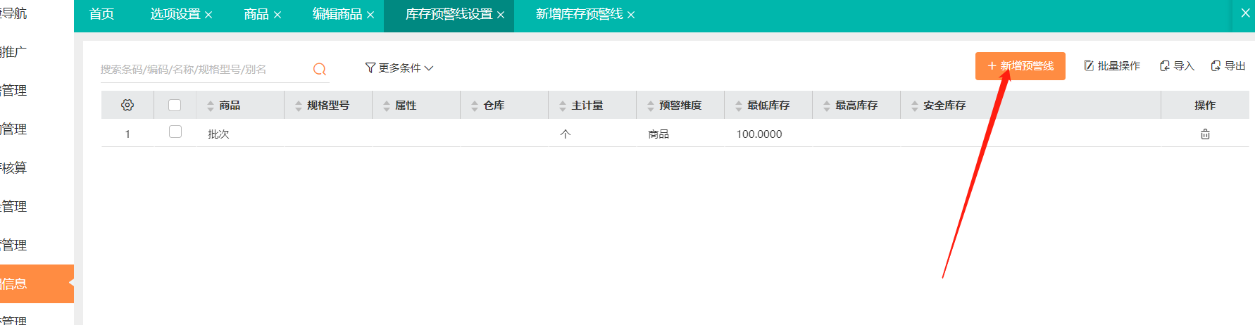 注:若需要按照將屬性作為庫存安全預(yù)警維度之一,需先在【系統(tǒng)管理】-選項設(shè)置-庫存設(shè)置中設(shè)置啟用商品屬性,保存設(shè)置后刷新整個網(wǎng)頁生效。