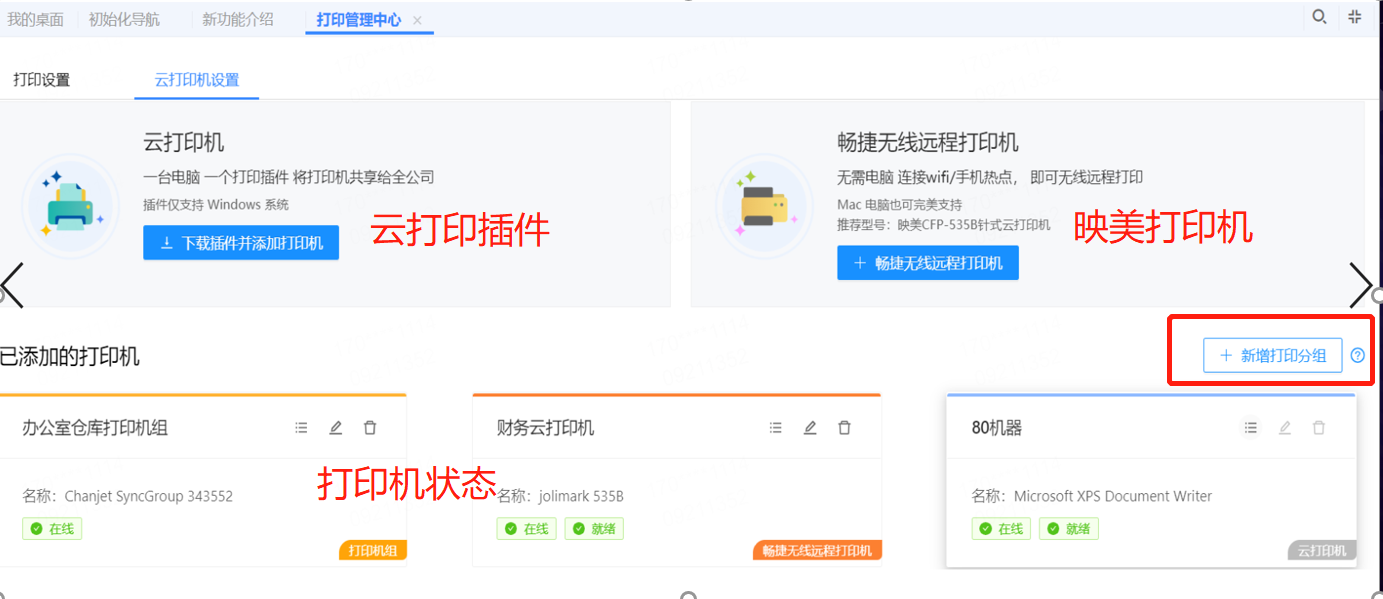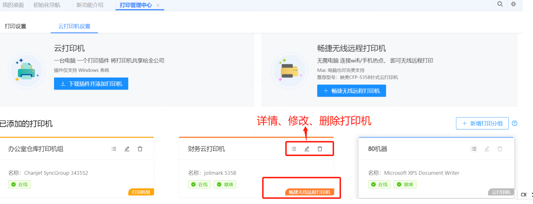 3>除映美外的普通云打印機(jī),只能在插件里進(jìn)行添加、修改、刪除,在打印管理中心中只支持查看狀態(tài)。