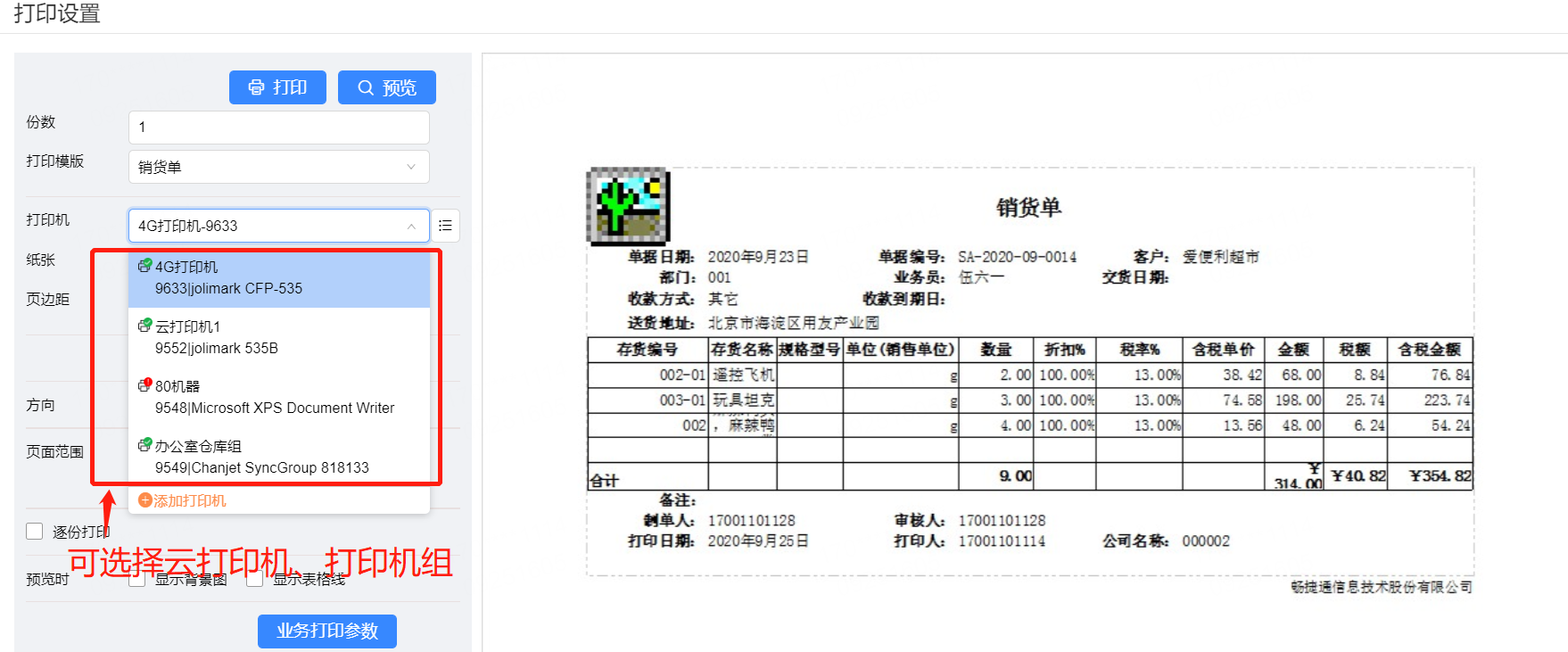 打印機(jī)組、映美打印機(jī)、普通云打印機(jī)設(shè)置好后,均可應(yīng)用在:單據(jù)、報(bào)表、列表、手機(jī)端、PDA中,在點(diǎn)擊“打印、預(yù)覽”時(shí),能選擇到云打印機(jī)、云打印機(jī)組,進(jìn)行打印。