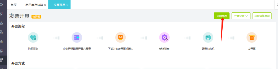 (1)點(diǎn)擊發(fā)票管理-發(fā)票開具-立即開通,購買發(fā)票開具服務(wù)。