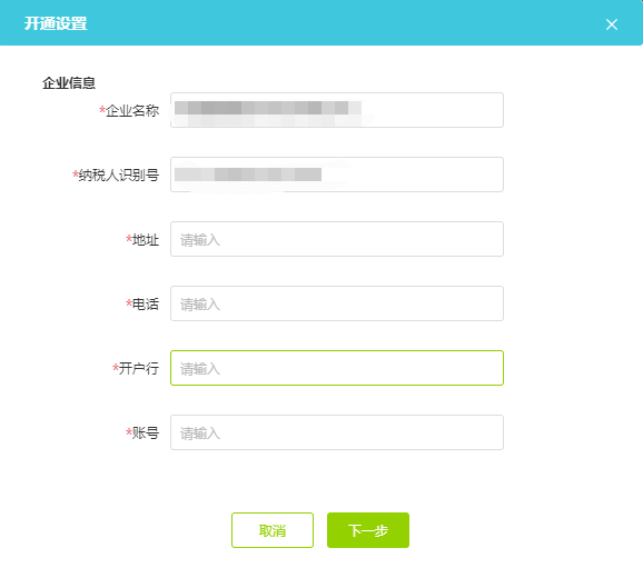 (2)購買發(fā)票開具服務(wù)后點(diǎn)擊立即開通填寫企業(yè)開票六要素,包括企業(yè)名稱、納稅人識(shí)別號、地址、電話、開戶行、賬號,選擇開票方式支持本地稅控盤、本地金稅盤、本地Ukey,下載安裝開票機(jī)器人后點(diǎn)擊確認(rèn)開通。