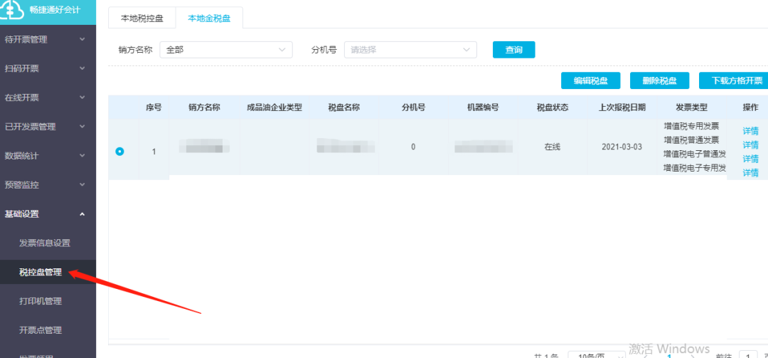 (3)確認(rèn)稅盤信息:確認(rèn)開通后點(diǎn)擊開票設(shè)置-稅盤管理,確認(rèn)稅盤信息無誤即可點(diǎn)擊在線開票