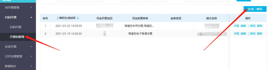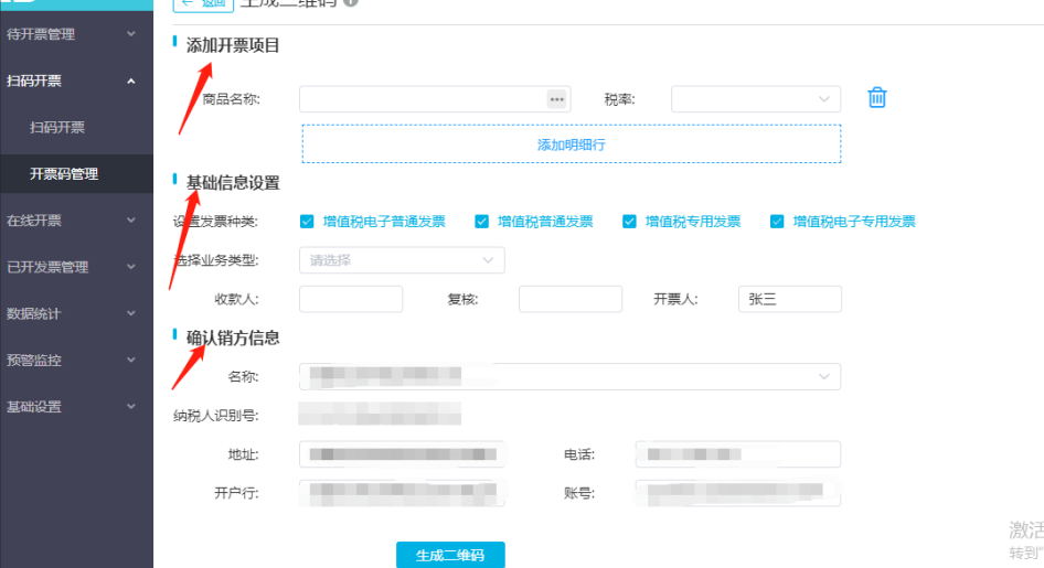 點(diǎn)擊掃碼開票-開票碼管理-生成二維碼,添加開票項(xiàng)目、設(shè)置開票基礎(chǔ)信息,確認(rèn)銷售方信息,確認(rèn)無誤點(diǎn)擊生成二維碼。