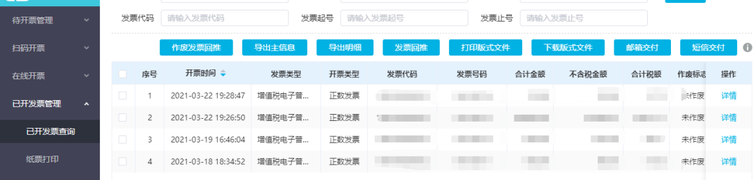 (5)交付發(fā)票:發(fā)票開出后可通過已開發(fā)票管理-已開發(fā)票查詢,查詢對應(yīng)開票,選擇對應(yīng)記錄點(diǎn)擊郵箱交付或短信將已開具好的發(fā)票交付給購方,通過郵箱或短信給客戶發(fā)送發(fā)票下載鏈接。