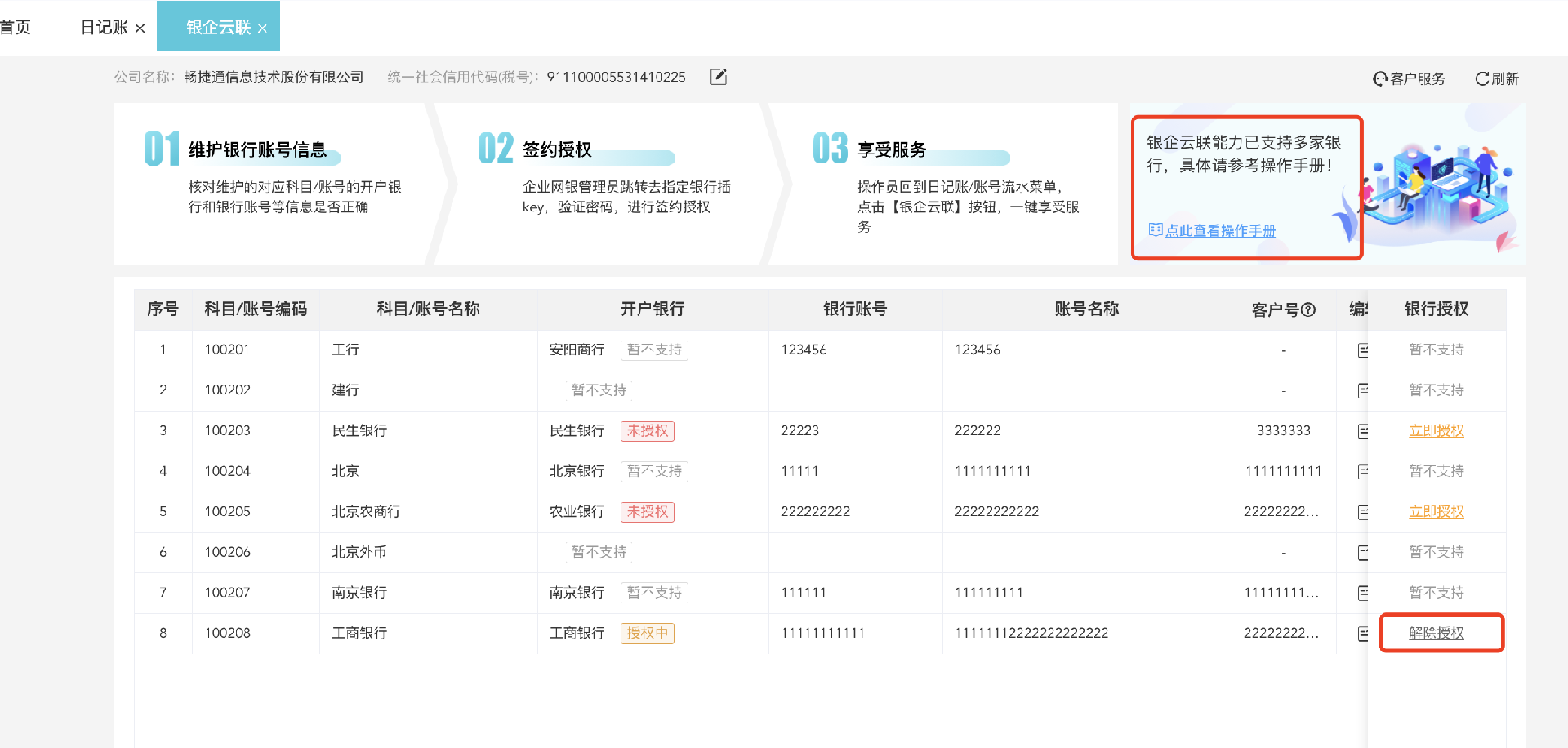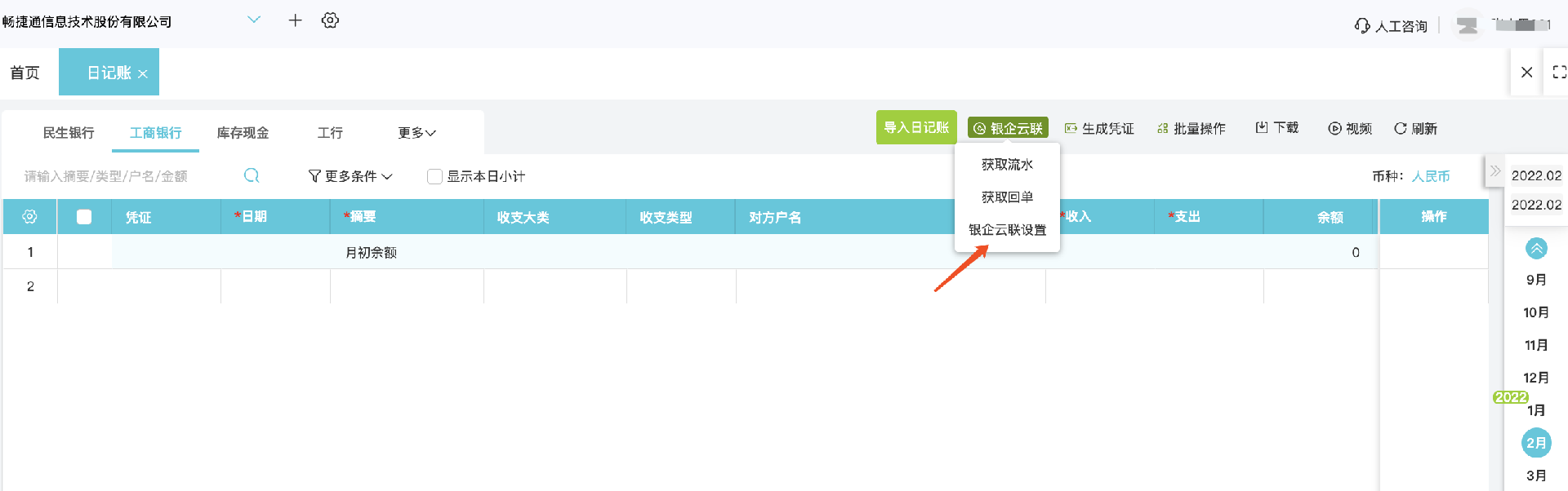 增加工行銀企云聯(lián)(僅活期賬戶),日記賬在線獲取銀行回單及銀行流水。