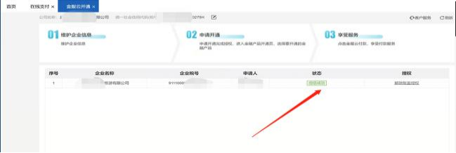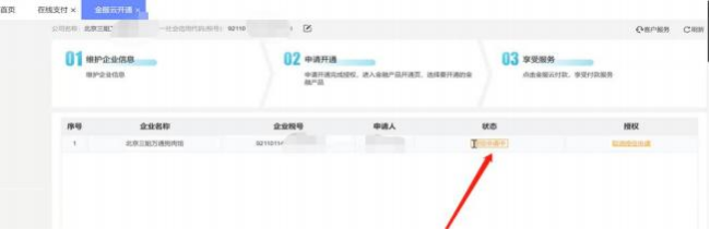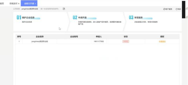 2、點(diǎn)擊【基礎(chǔ)信息】 —【在線支付】 —授權(quán)【金服云】, 跳轉(zhuǎn)開通界面完善企業(yè)名稱及稅號(hào)。 企業(yè)名稱及稅號(hào)嚴(yán)格對(duì)應(yīng),輸入真實(shí)數(shù)據(jù)。