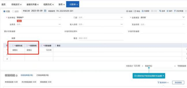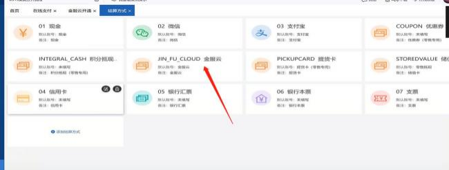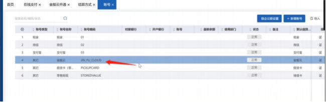 9、授權(quán)成功后,結(jié)算方式自動(dòng)新增【金服云】的結(jié)算方式,賬號(hào)也會(huì)新增【金服云】賬號(hào), 不能修改不能刪除,也不能新增別的賬號(hào)去引用。