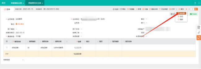 產(chǎn)品解決方案:①費(fèi)用支出單保存后點(diǎn)擊右上角的操作【添發(fā)票】, 輸入發(fā)票號(hào)發(fā)票金額等數(shù) 據(jù),可添加多張發(fā)票。