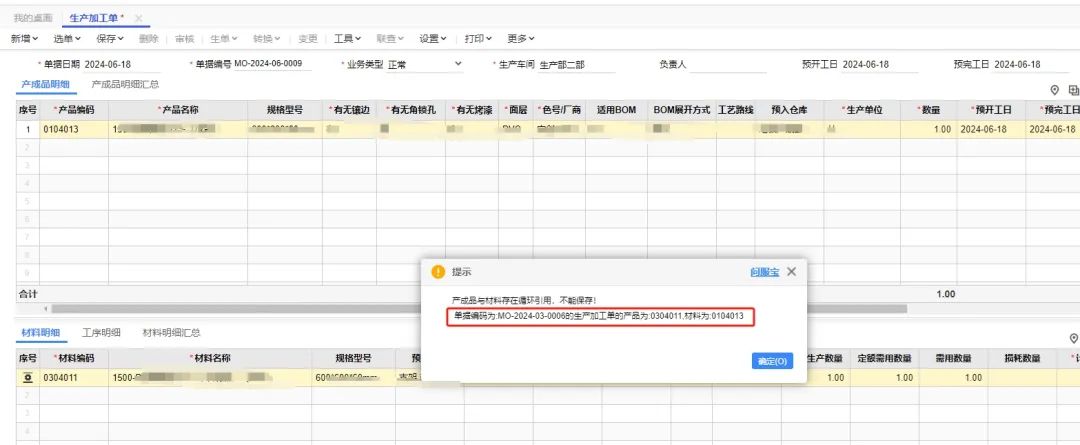 生產(chǎn)加工單保存提示:產(chǎn)成品與材料存在循環(huán)引用,不能保存!