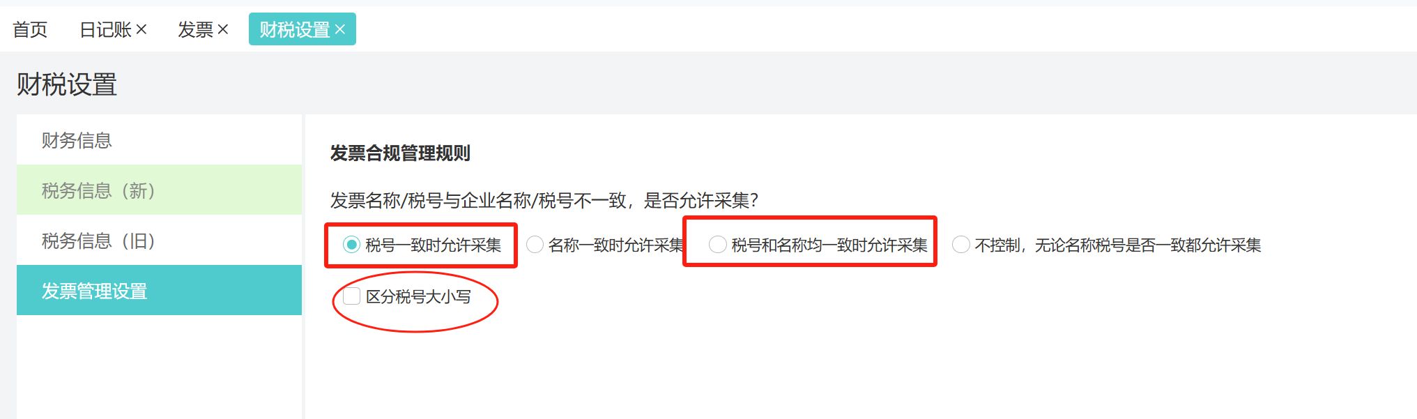財稅設(shè)置選項,增加是否區(qū)分大小寫。啟用后,pdf上傳、拍照識別,系統(tǒng)會判斷稅號大小寫