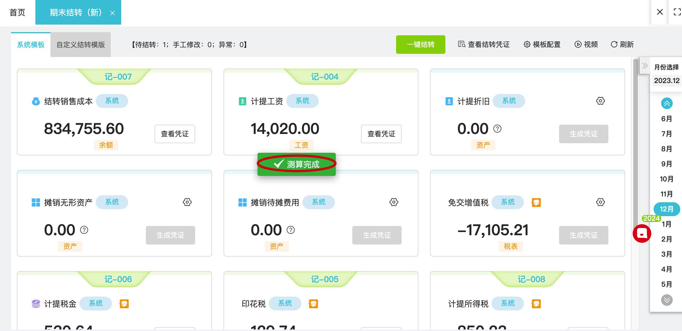 操作路徑:【結(jié)賬】-【期末結(jié)轉(zhuǎn)】-【一鍵結(jié)轉(zhuǎn)】