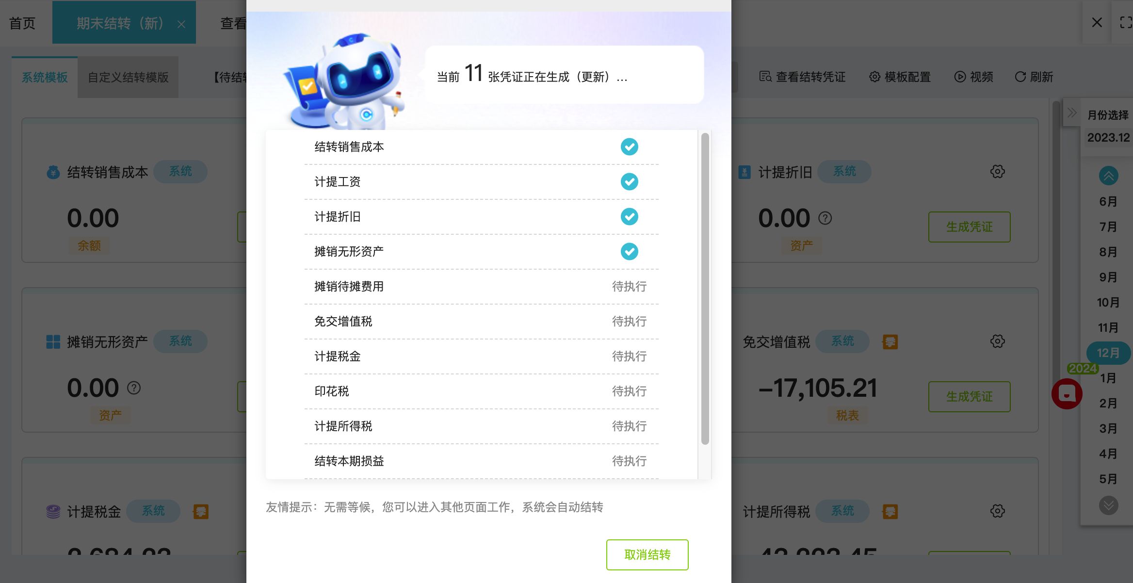 一鍵生成期末結(jié)轉(zhuǎn)憑證,無需手工逐張點擊、結(jié)轉(zhuǎn),提高效率(本次僅支持13小企業(yè)會計準則、07企業(yè)會計準則);