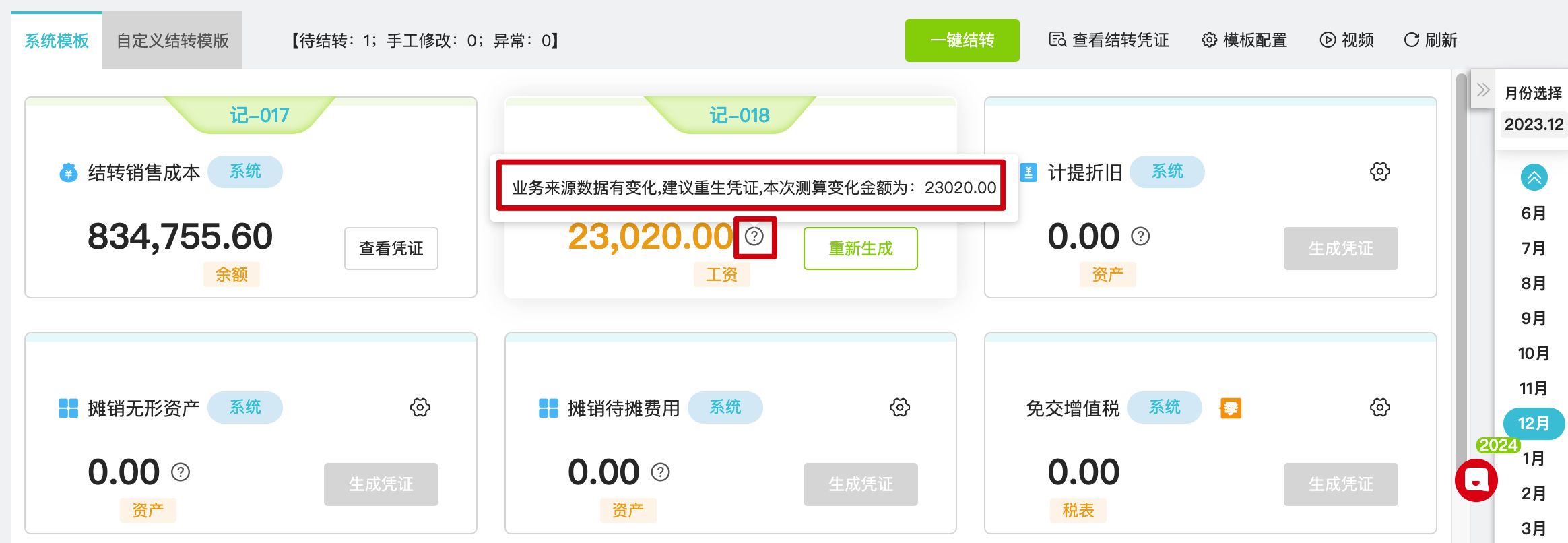 例:計提工資憑證從工資表取數(shù),經(jīng)過一鍵期末結(jié)轉(zhuǎn)后,工資表數(shù)據(jù)有變化。再次進入期末結(jié)轉(zhuǎn)后,計提工資卡片字體變?yōu)槌壬?,點擊“問號”會有提示。