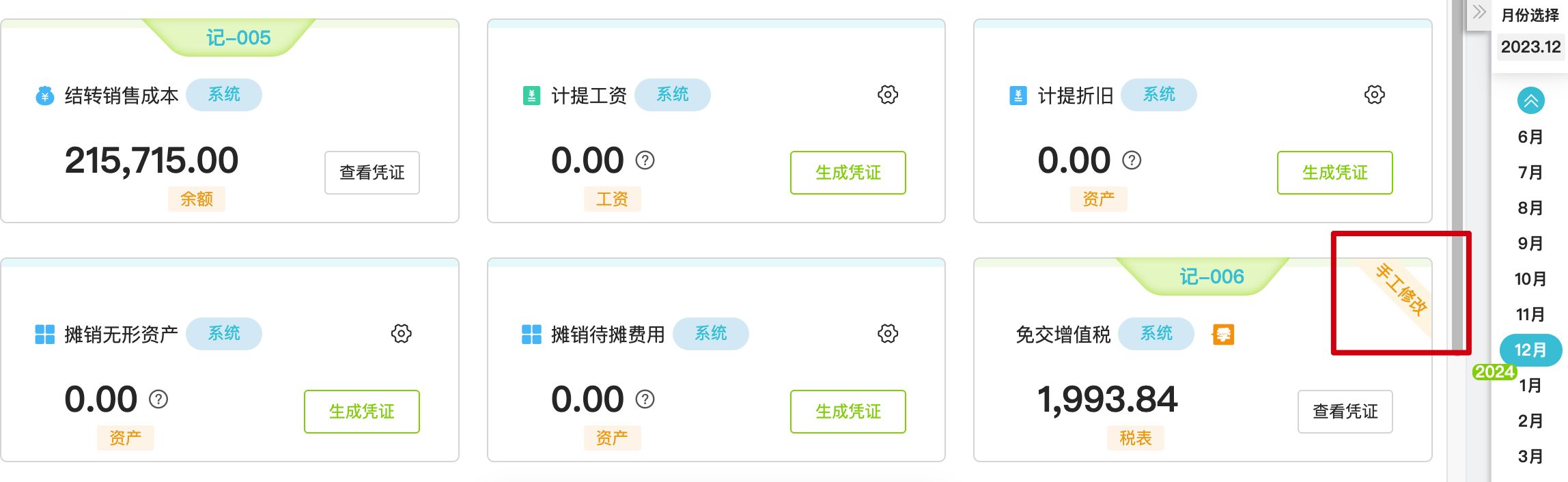 注:手工修改憑證后會打上"手工憑證"的標識,下次系統(tǒng)一鍵結(jié)轉(zhuǎn)的時候會跳過。若期望再次使用系統(tǒng)期末結(jié)轉(zhuǎn),需要先刪除這張手工憑證。