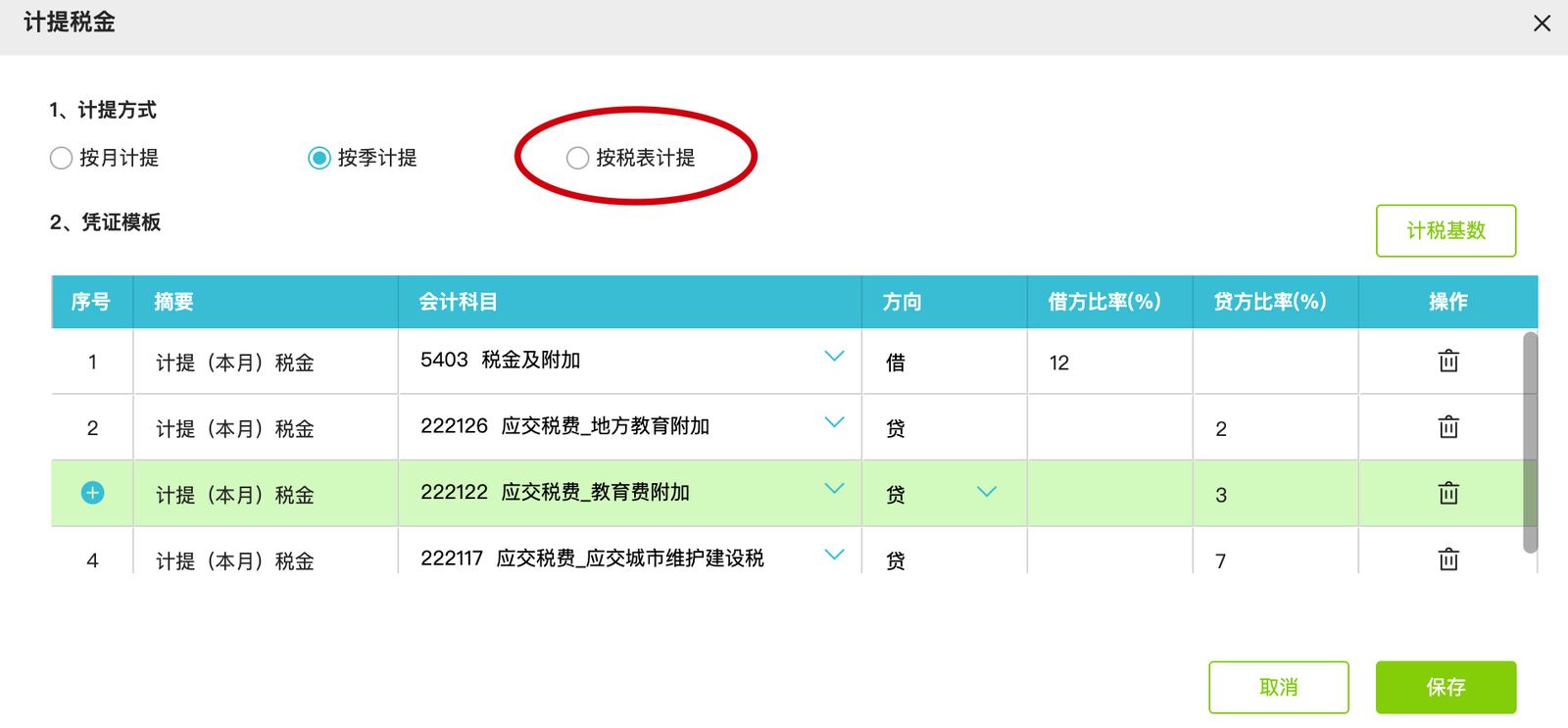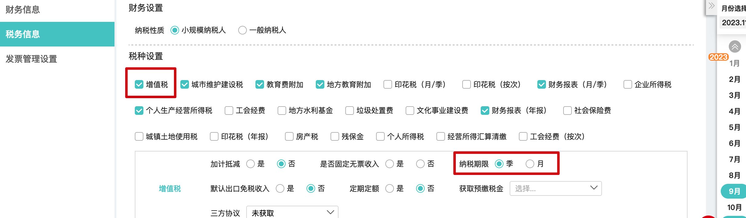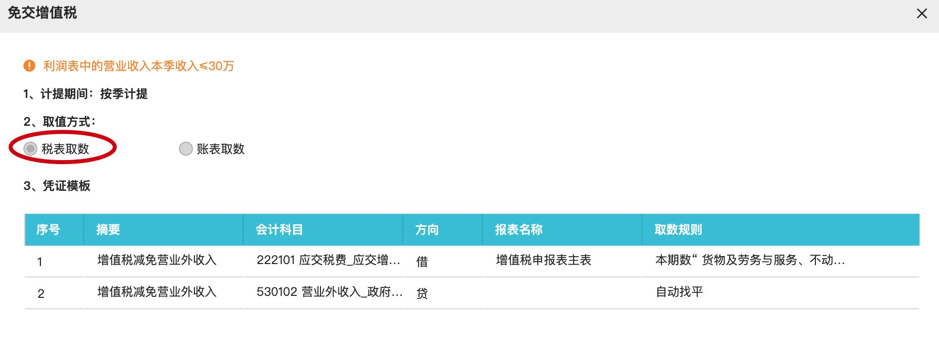 注意事項:如果取值方式是稅表取值,若看不到模版,請檢查財稅設(shè)置,是否啟用稅種,并檢查納稅期限。月度按月顯示,季度按季顯示。