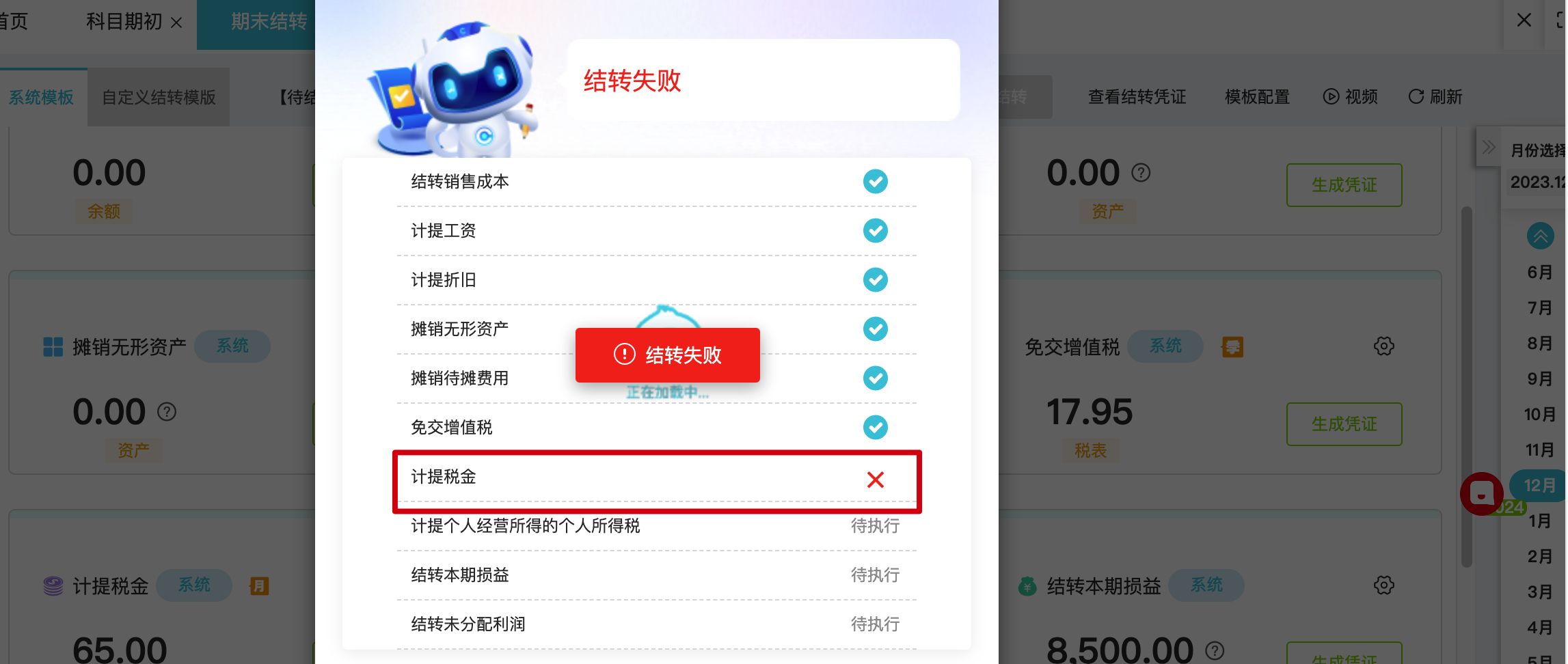 查看錯誤原因并進行修復(fù)。例:科目被禁用的場景需要啟用科目或更改期末結(jié)轉(zhuǎn)的科目配置。
