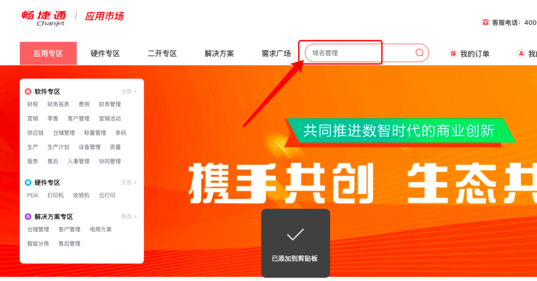 1,在暢捷通應(yīng)用市場market.chanjet.com,搜索“域名管理”