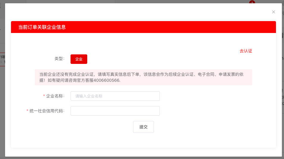 3,第一次購買的企業(yè),需填寫完企業(yè)認證,在提交訂單