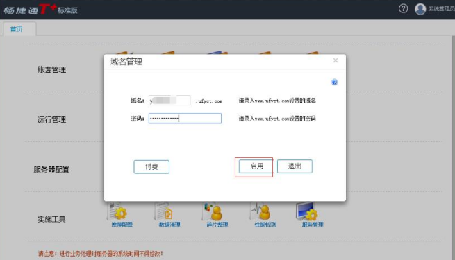 3,在彈出的對話框輸入剛申請的域名及密碼,點擊“啟用”。(在平臺新購的域名與密碼一致)