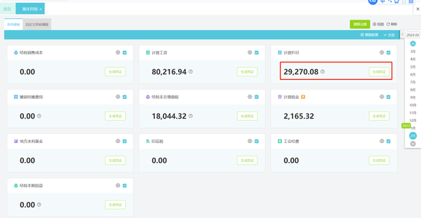 當(dāng)月新增的固定資產(chǎn),系統(tǒng)從下個(gè)月起開始生成折舊憑證,進(jìn)入【結(jié)賬】-【期末結(jié)轉(zhuǎn)】,先點(diǎn)擊右上角【測(cè)算金額】,系統(tǒng)自動(dòng)計(jì)算出本月折舊費(fèi)用后,點(diǎn)擊【計(jì)提折舊】下方【生成憑證】,當(dāng)月的累計(jì)折舊憑證就直接生成了。