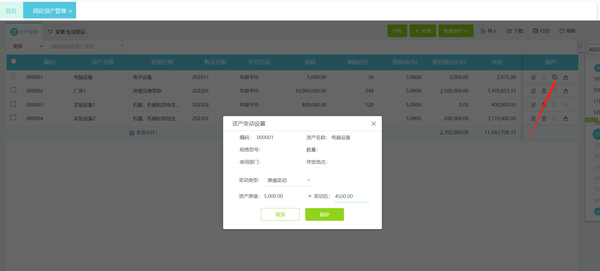 進(jìn)入【固定資產(chǎn)】-【固定資產(chǎn)管理】-【資產(chǎn)明細(xì)】,點(diǎn)擊需要變更的固定資產(chǎn)右側(cè)第三個(gè)圖標(biāo),