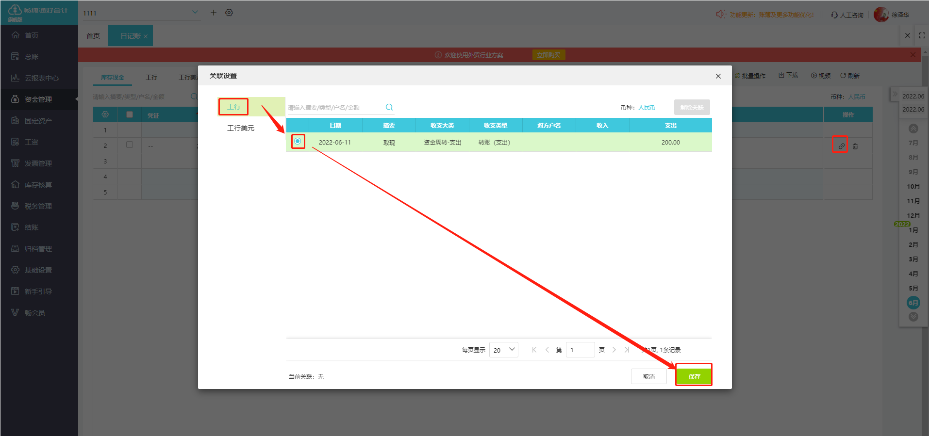 2、選擇需要關(guān)聯(lián)的另一條流水記錄,點擊【保存】,進行關(guān)聯(lián)。