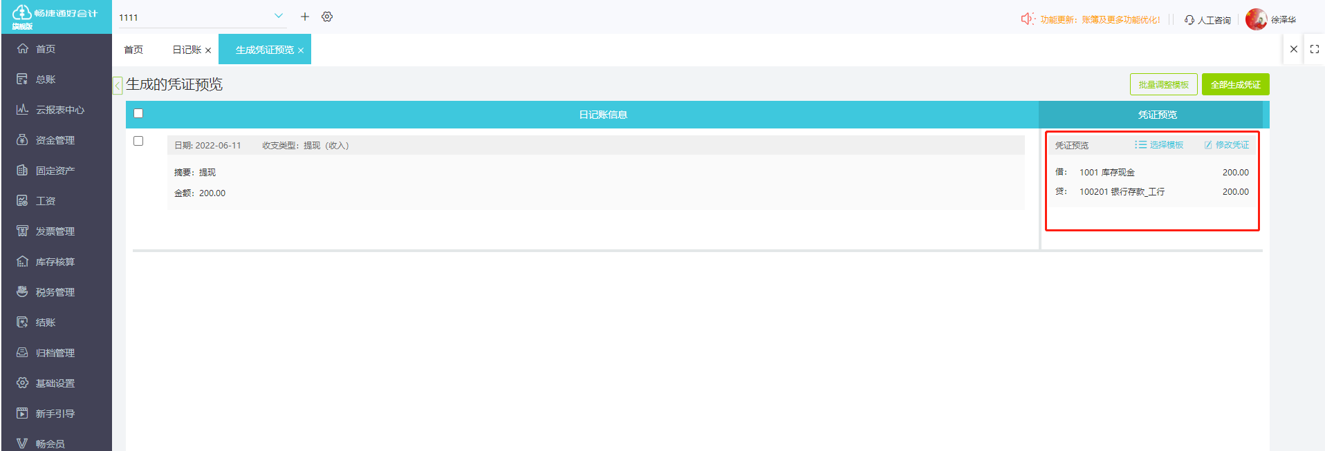 3、關(guān)聯(lián)后,點擊【生成憑證】,兩條流水記錄只生成同一張憑證,避免相同業(yè)務(wù)重復(fù)生成憑證。