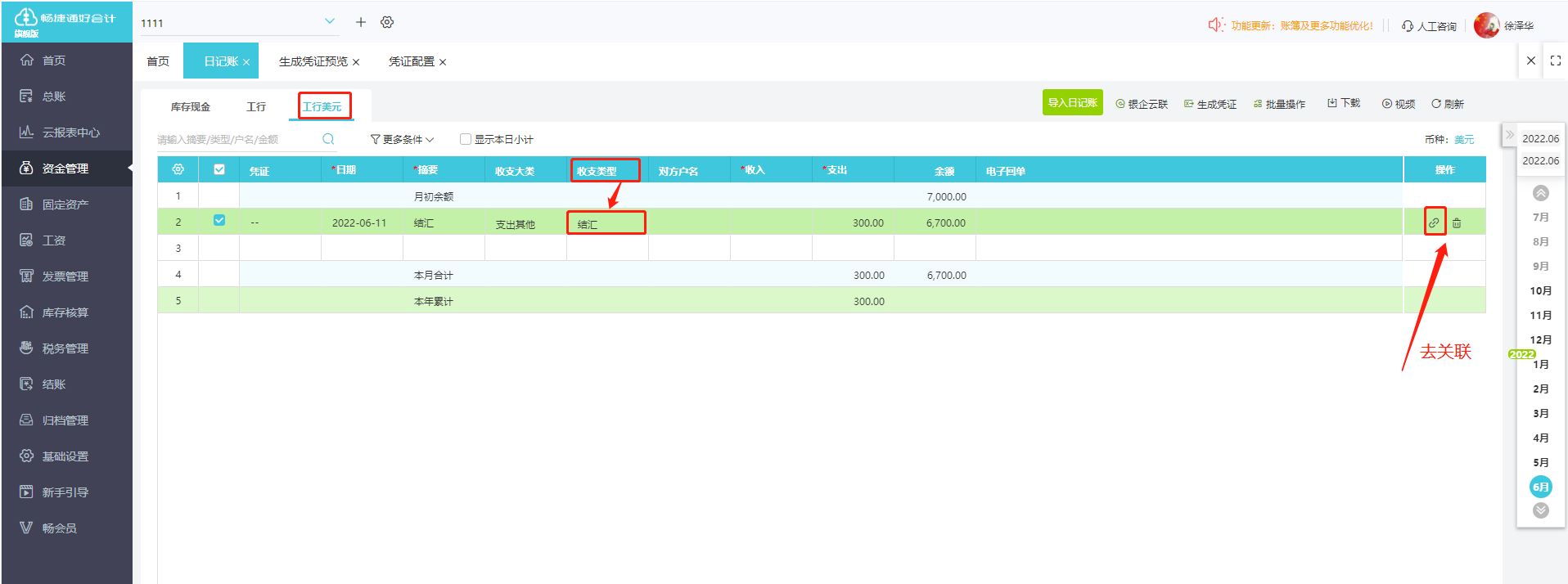 此時,只需要將外幣賬戶中該流水的收支類型改為【結(jié)匯】,就可以去關(guān)聯(lián)金額不等的人民幣賬戶,其他其他操作與第一種情況一致。