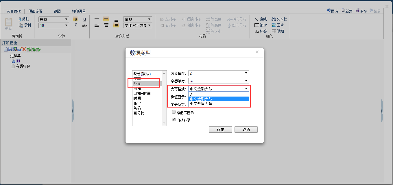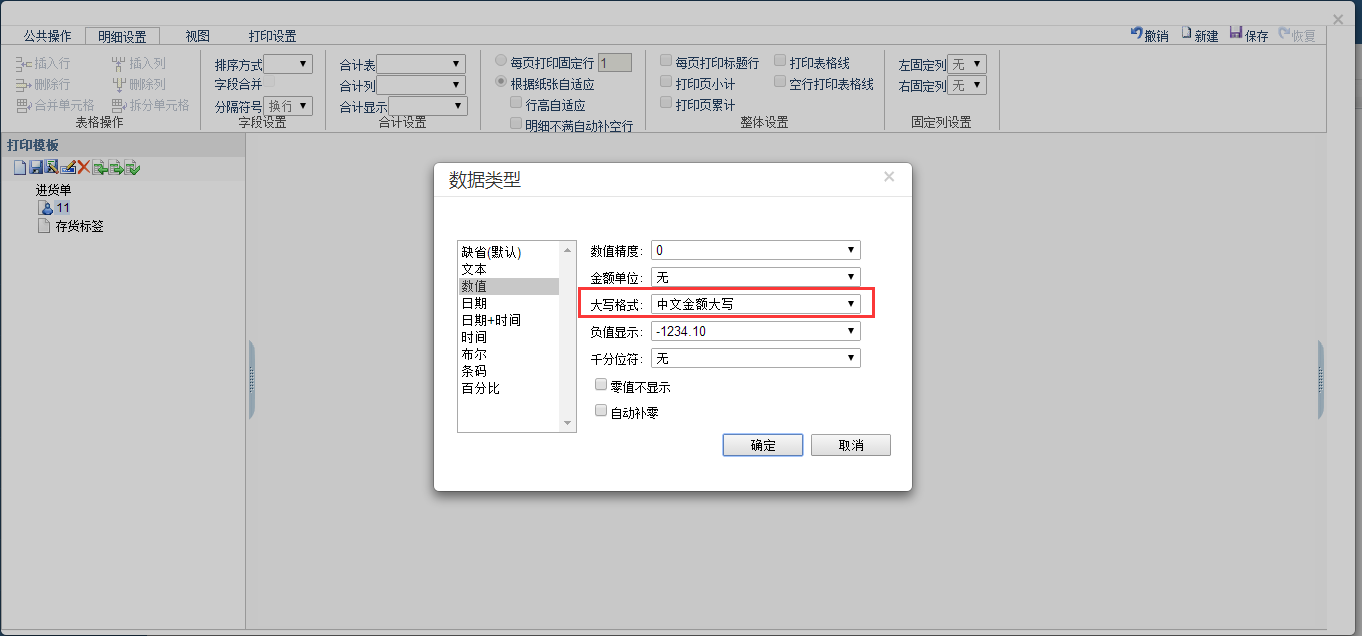 取數(shù)公式設(shè)置完成后,選擇單元格—右鍵—數(shù)據(jù)類型數(shù)值中選為中文金額大寫,設(shè)置完成保存模板。