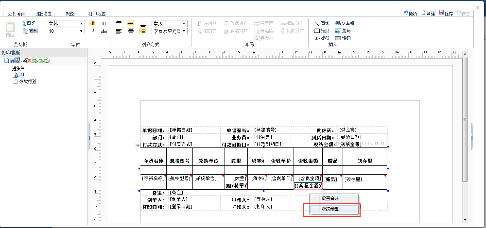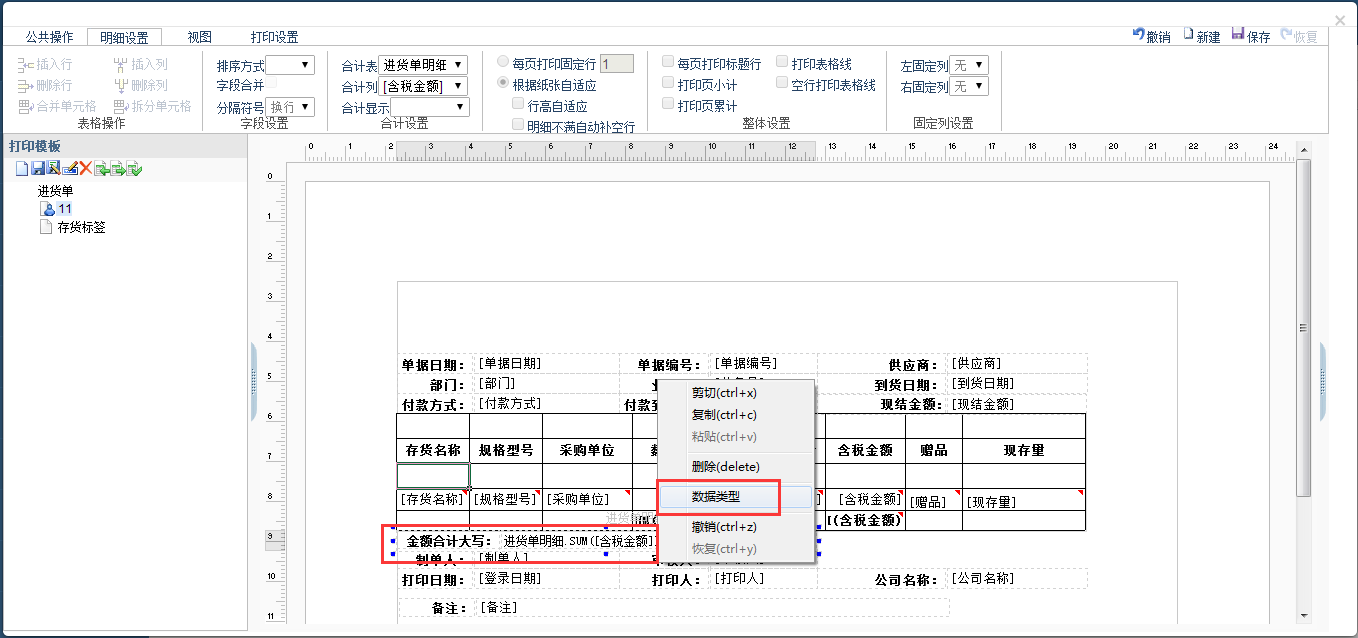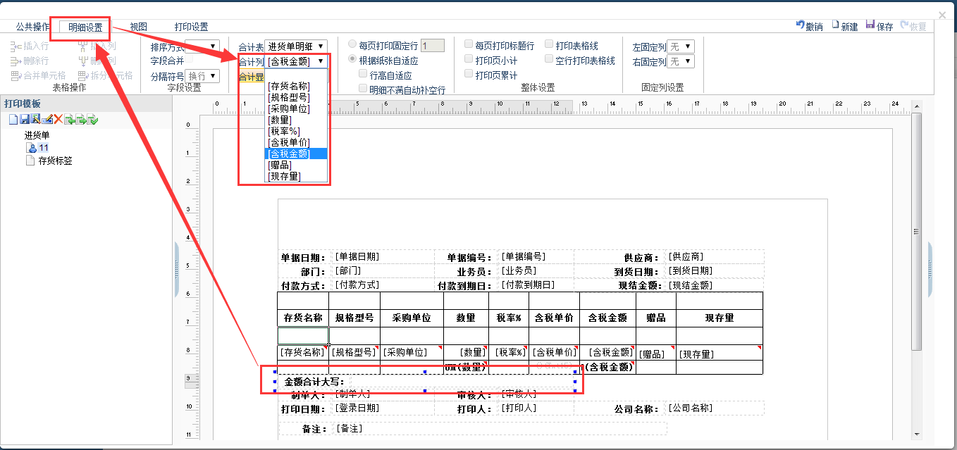 新增文本框之后,修改顯示名稱為“金額合計(jì)大寫”,選擇該文本框之后,點(diǎn)擊明細(xì)設(shè)置,合并列中選擇對(duì)應(yīng)要取數(shù)的字段(下圖設(shè)置效果即是,文本框的值等于表體的含稅金額)。