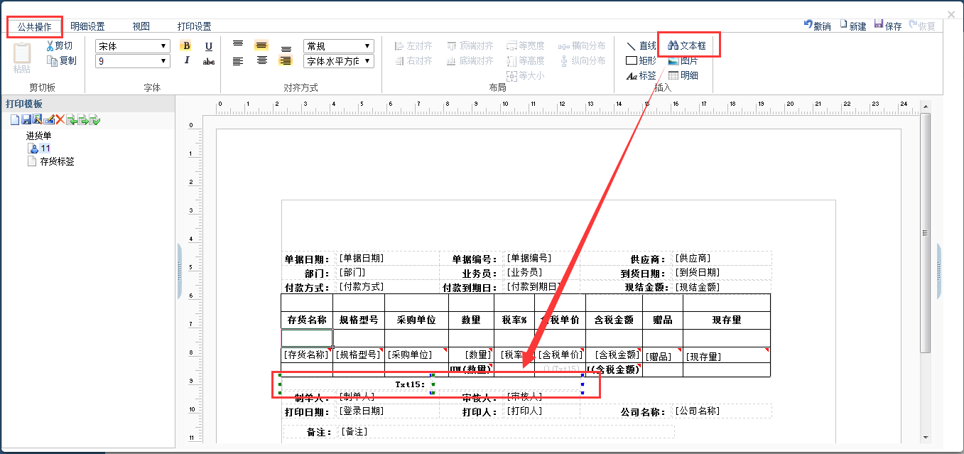 在公共操作中點(diǎn)擊文本框,在表尾中新增一個(gè)文本框顯示到對(duì)應(yīng)的位置(下圖是把原備注拉動(dòng)到最下面,然后將新增的文本框放到備注的位置上)。