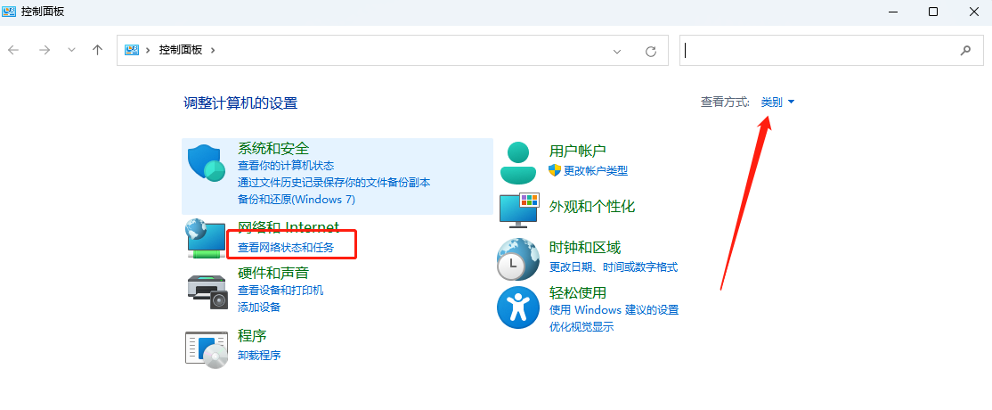 第二步. 在控制面板操作界面中,將查看方式改為類別,找到查看網(wǎng)絡(luò)狀態(tài)和任務(wù)并打開