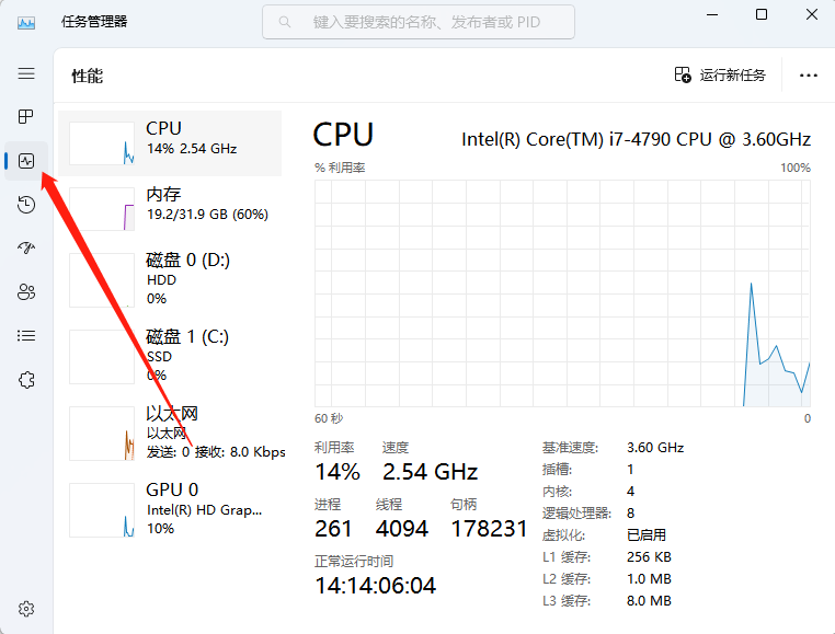 2.在“任務(wù)管理器”里,切換到“性能”選項(xiàng)卡