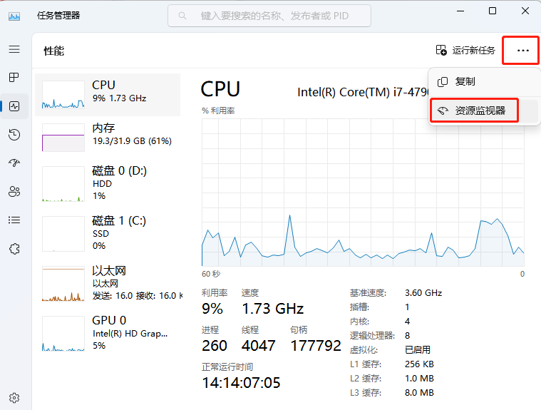 3.點(diǎn)擊右上角三個(gè)點(diǎn),選擇‘資源監(jiān)視器’