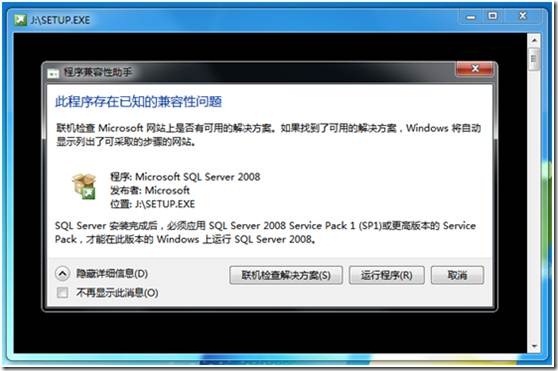 在Windows7操作系統(tǒng)啟動Microsoft SQL 2008安裝程序后,系統(tǒng)兼容性助手將提示軟件存在兼容性問題,在安裝完成之后必須安裝SP1補(bǔ)丁才能運(yùn)行,如圖1-1所示。這里選擇“運(yùn)行程序”開始SQL Server 2008的安裝。