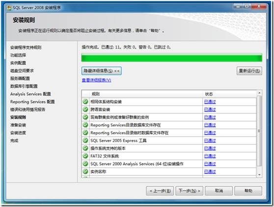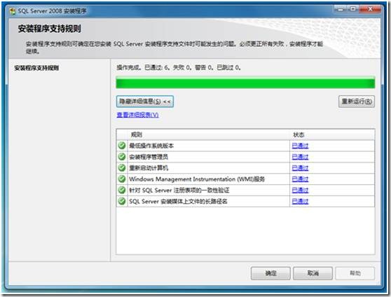 之后進(jìn)入“安裝程序支持規(guī)則”安裝界面,安裝程序?qū)⒆詣訖z測安裝環(huán)境基本支持情況,需要保證通過所有條件后才能進(jìn)行下面的安裝,如圖1-5所示。當(dāng)完成所有檢測后,點(diǎn)擊“確定”進(jìn)行下面的安裝。