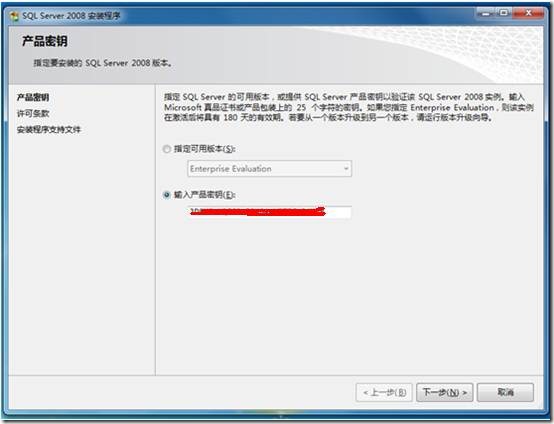 接下來是SQL Server2008版本選擇和密鑰填寫,本文以“Enterprise Evaluation”為例介紹安裝過程,密鑰可以向Microsoft官方購買,如圖1-6所示。