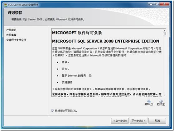 在許可條款界面中,需要接受Microsoft軟件許可條款才能安裝SQL Server2008,如圖1-7所示。
