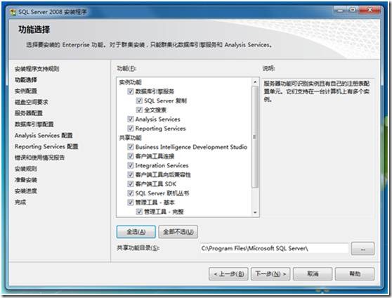 通過“安裝程序支持規(guī)則”檢察之后進(jìn)入“功能選擇”界面,如圖1-10所示。這里選擇需要安裝的SQL Server功能,以及安裝路徑。建議:由于數(shù)據(jù)和操作日志文件可能會特別龐大,請謹(jǐn)慎選擇安裝路徑,或在建立數(shù)據(jù)庫時選擇專有的保存路徑。