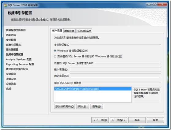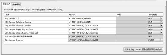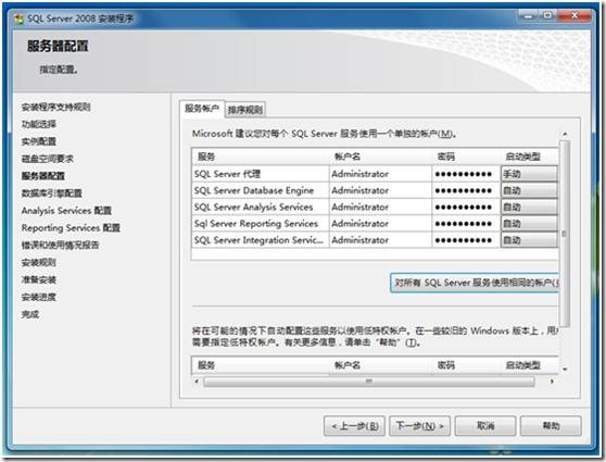 如圖1-13所示,在服務(wù)器配置中,需要為各種服務(wù)指定合法的賬戶。注意:這里需要根據(jù)用戶實際需求做出調(diào)整,本文沒有深入研究用戶設(shè)置的影響,統(tǒng)一使用一個用戶“Administrator”,由此產(chǎn)生的影響在以后的日志中會補(bǔ)充說明。