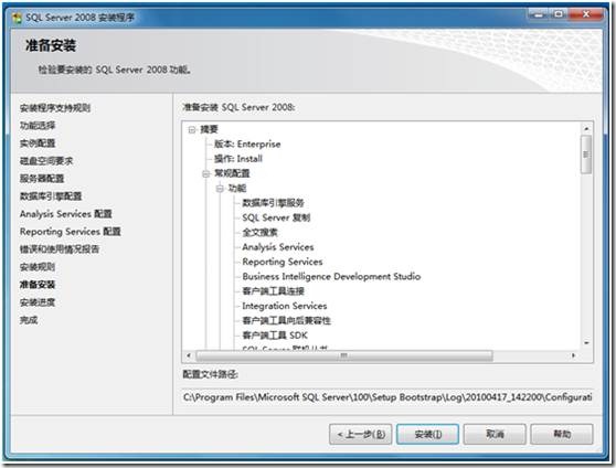 當(dāng)通過檢察之后,軟件將會列出所有的配置信息,最后一次確認(rèn)安裝,如圖1-19所示。點(diǎn)擊“安裝”開始SQL Server安裝