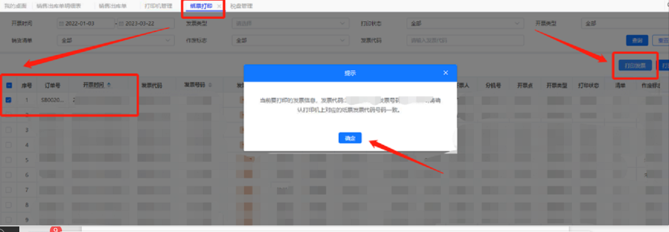 5、進入【紙票打印】打印選擇發(fā)票后點擊【打印發(fā)票】-點擊【確定】