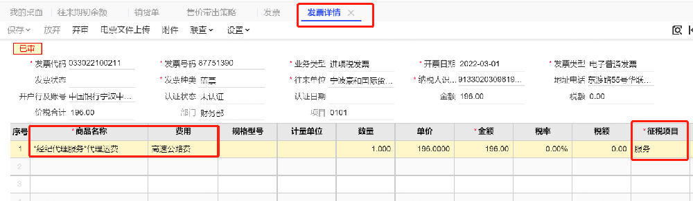 2、上圖可知,采集的發(fā)票是購買服務所產(chǎn)生的費用類進項發(fā)票,需要注意科目設置內(nèi)費用科目、結算科目會影響發(fā)票生成憑證所對應的科目。
