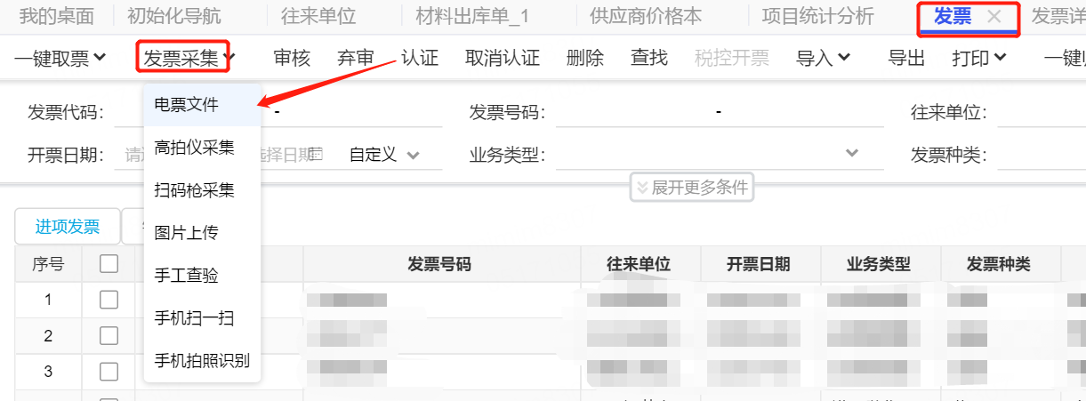 2、采集一張山西XXXX往來(lái)單位的進(jìn)項(xiàng)發(fā)票,進(jìn)入【發(fā)票】-【發(fā)票采集】,采集方式可以按需求選擇。