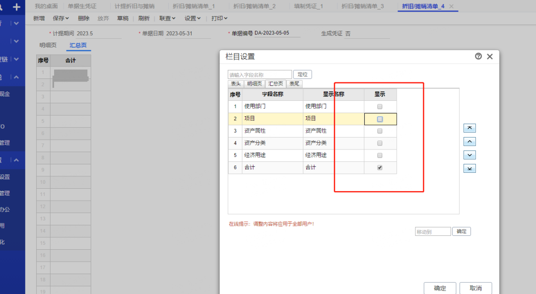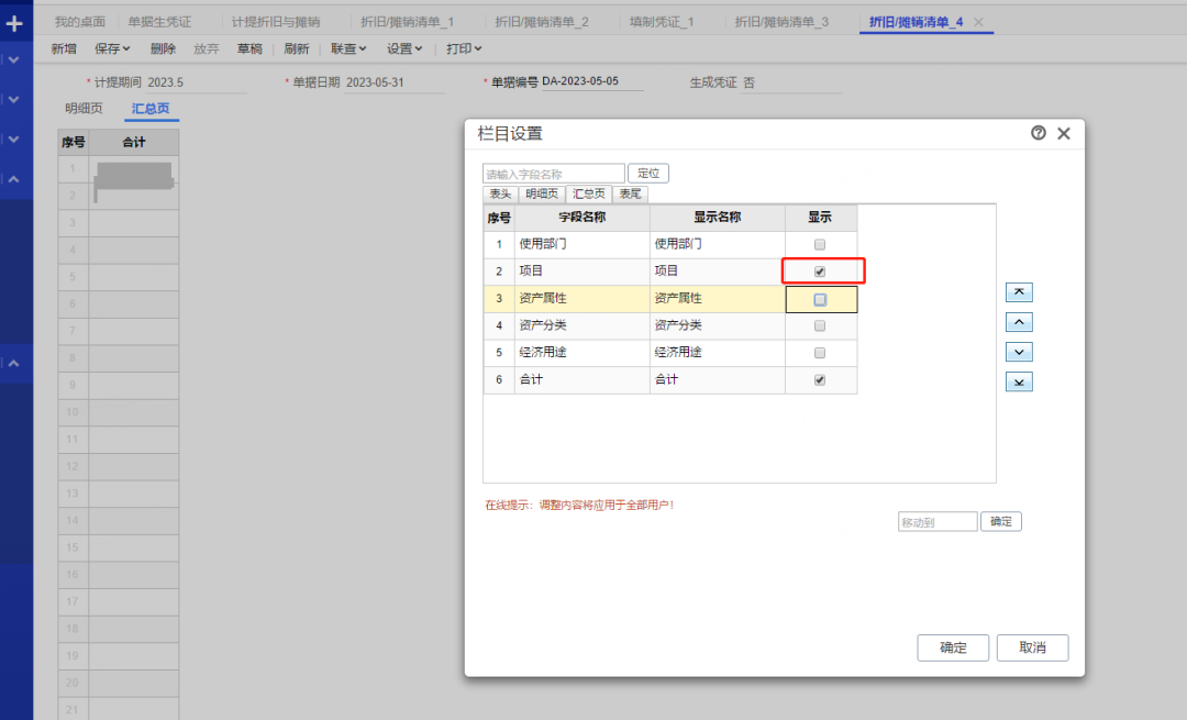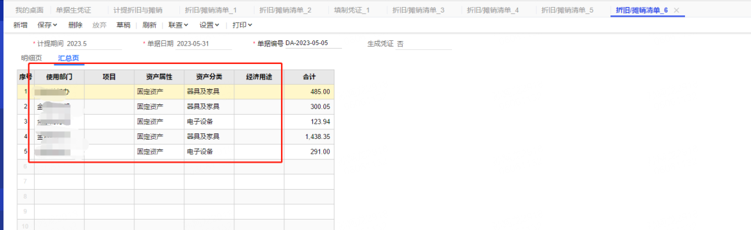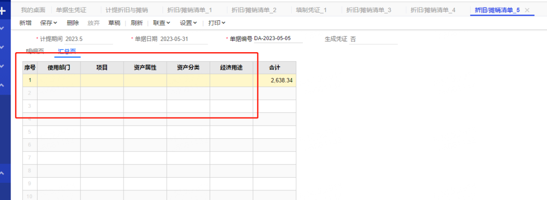 折舊清單頁面設(shè)置->單據(jù)設(shè)置 中的 匯總表頁簽,將使用部門、項目、資產(chǎn)屬性、資產(chǎn)分類這四項中勾選顯示,否則沒有匯總項,無法對本月折舊額進行匯總