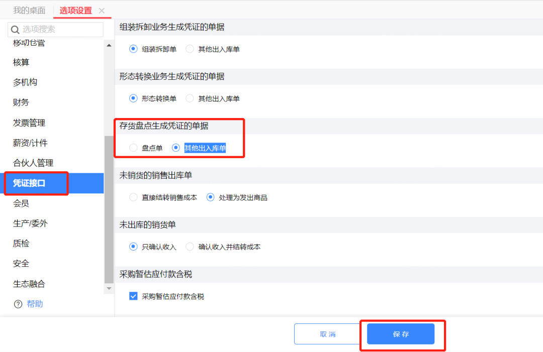 1、依次點擊【系統(tǒng)管理】-【選項設置】-【憑證接口】,把【存貨盤點生成憑證的單據(jù)】選成【其他出入庫單】