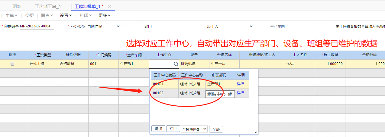 2、【工序派工單】、【工序匯報(bào)單】表體明細(xì),選擇【工作中心】字段的對(duì)應(yīng)方案,自動(dòng)帶出對(duì)應(yīng)部門、班組、工人