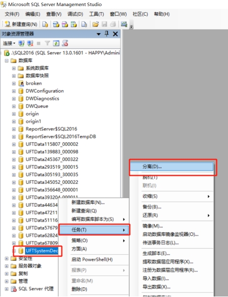 1. 點擊安裝T+軟件的服務(wù)器桌面【開始】-【所有程序】-【SQL server management studio】,進入數(shù)據(jù)庫,在左側(cè)列表中找到T+的系統(tǒng)庫【uftsystem】,右擊【任務(wù)】-【分離】,即可將系統(tǒng)庫分離;