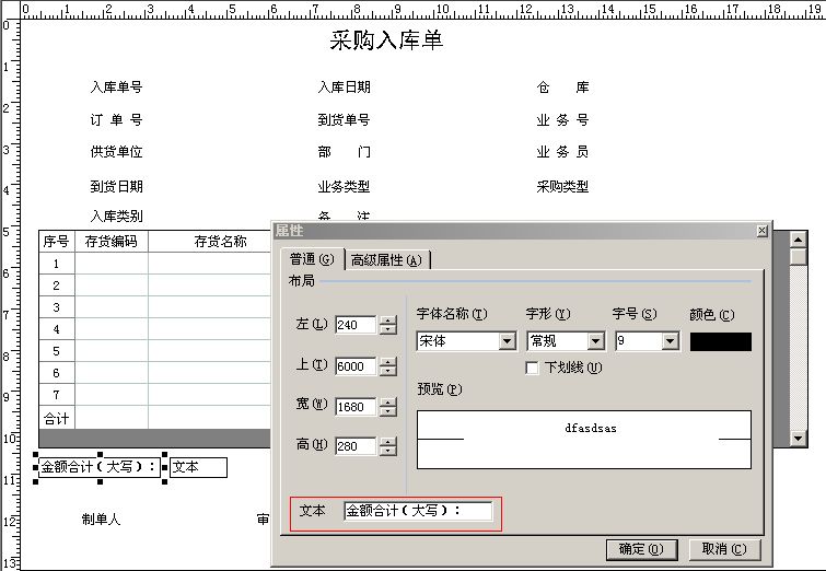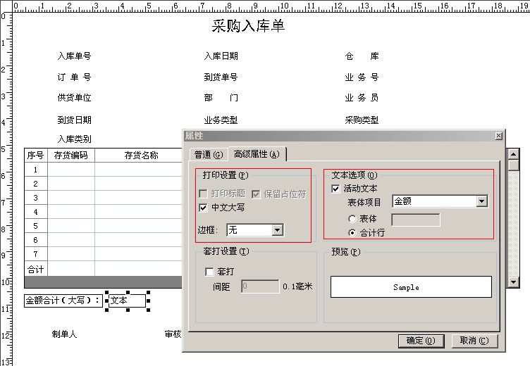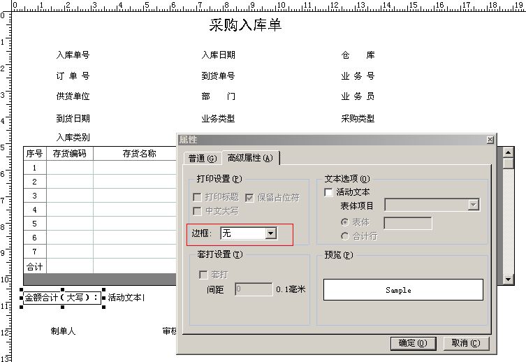 右擊第一個(gè)文本框,選擇“屬性”,在文本欄中錄入“金額合計(jì)(大寫):”,并在高級(jí)屬性頁簽下,設(shè)置 邊框?yàn)椤盁o”。