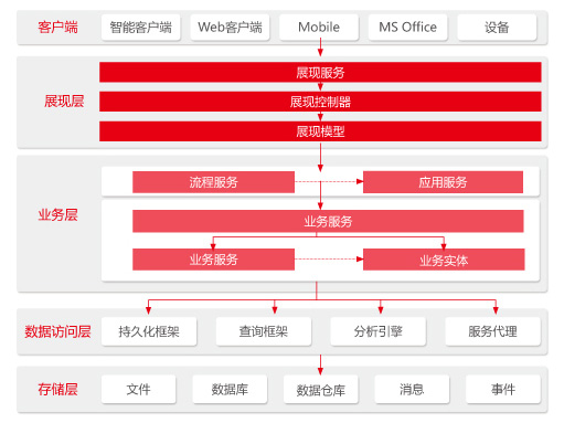 NC6產(chǎn)品的技術(shù)架構(gòu)采用分層體系結(jié)構(gòu),自下而上包括了存儲(chǔ)層、數(shù)據(jù)訪問層、業(yè)務(wù)層、展現(xiàn)層和客戶端。